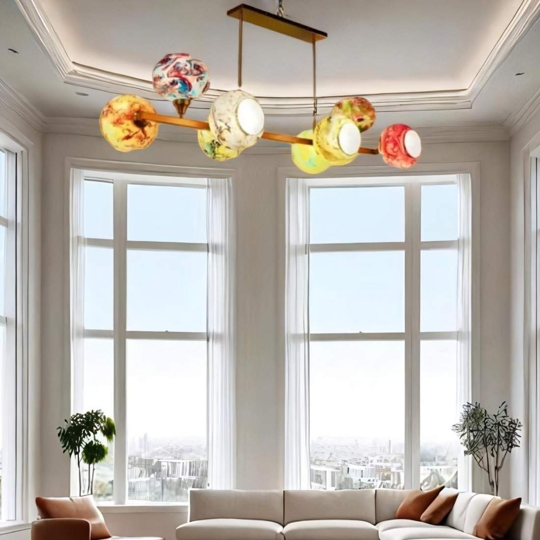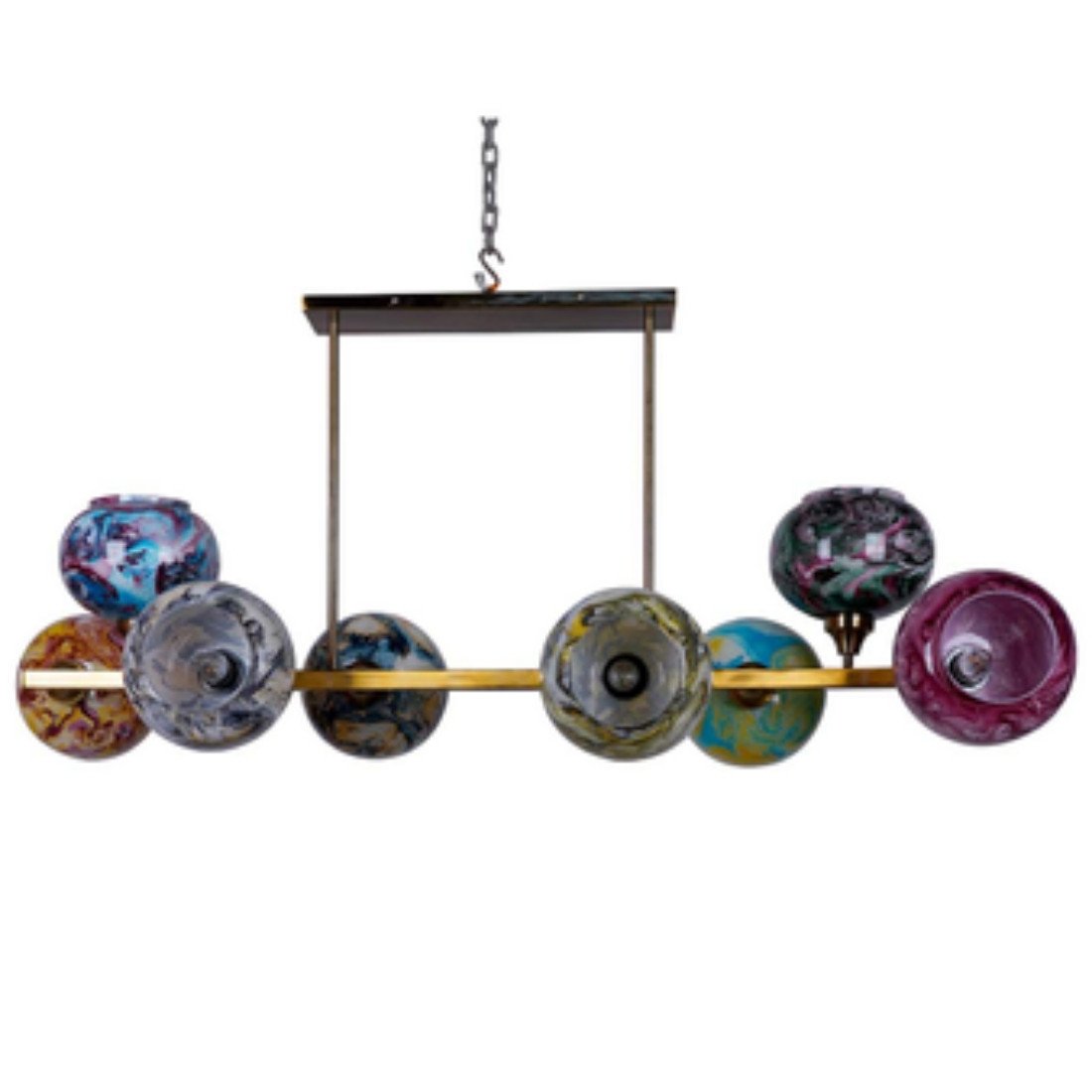 This modern glass candelabra is well-liked, modish & durable. It features a cluster of assorted multi-colored glass marble globes attached to a circular steel frame in an antique gold finish. The multicolor globe lights generate a sense of contemporary & modern design. The chandelier is eye-catching and a great focal point in places like the lobby, living or dining room.